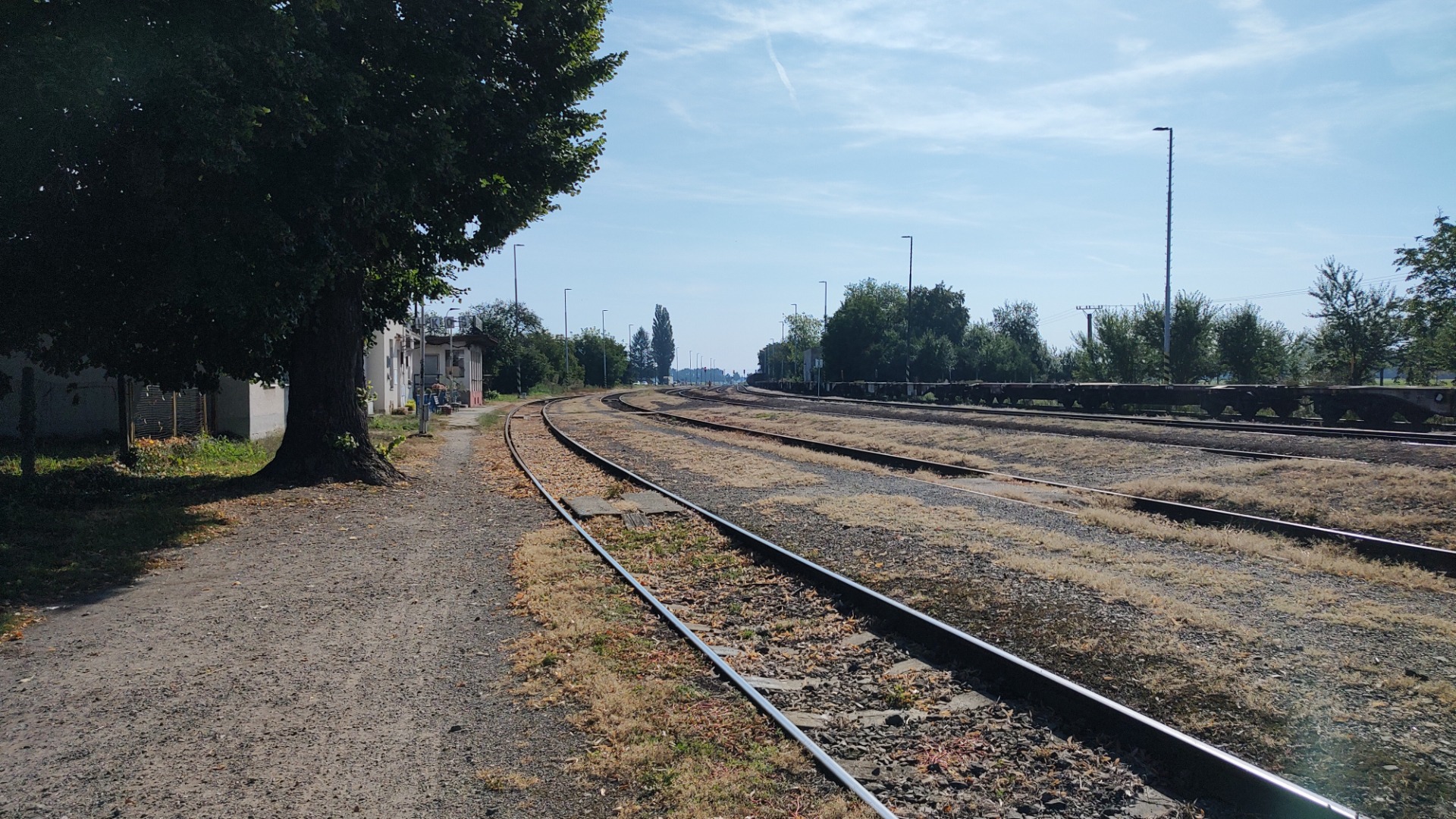 Teď už je asi jasné, kam bude stavba trati pokračovat. V prvním mezizastávkovém úseku Bzenec - Vracov jsou už položeny obě traťové koleje, zatím bez jakýchkoliv úprav terénu či krajiny. Přejezd, který je vidět na screenu dole, označuje polohu budoucí zastávky Vracov.